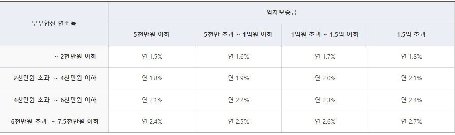 전세 자금이 부족한 신혼부부를 위한 정책이며 대출 금리는 연 1.5%~2.7% 인데, 소득과 가고자 하는 임차 보증금의 액수에 따라 금리 구간이 나누어 집니다.