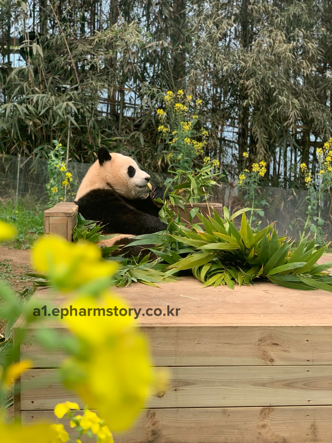 유채꽃이 보이는 가운데 평상에서도 대나무를 먹기 시작하는 푸바오입니다.